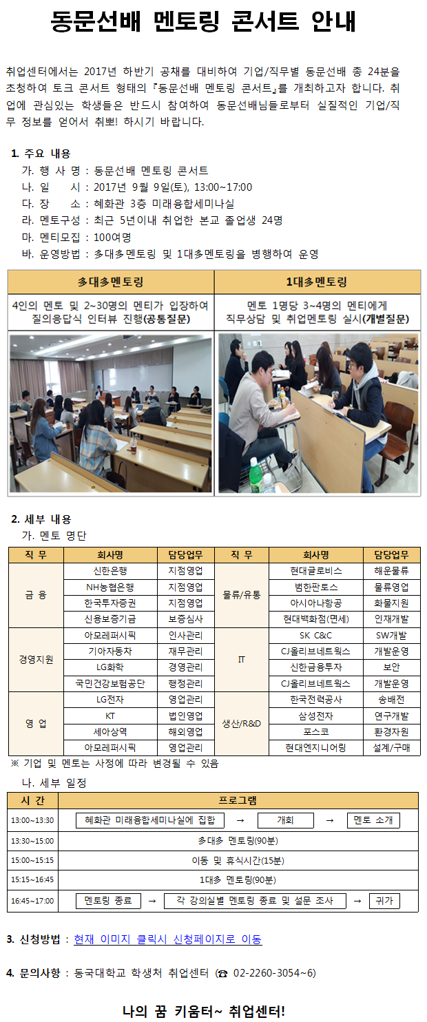 동문선배 멘토링 콘서트(9/9 토, 13시, 혜화관 미래융합세미나실 링크참조 (http://job.dongguk.edu/program/event_program_view.asp?cate_code=04&program_idx=2384&page=1&)